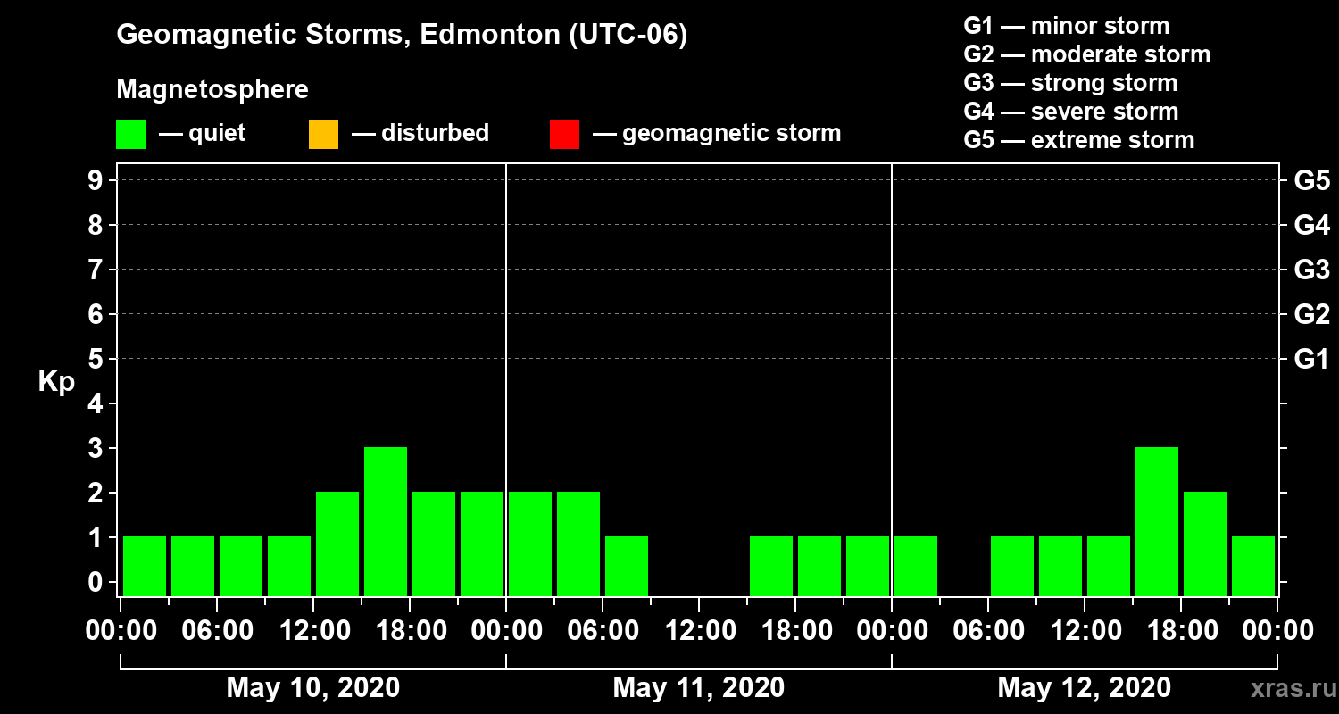 Changes in the geomagnetic index Kp from May 10 to 12, 2020 for mid latitudes