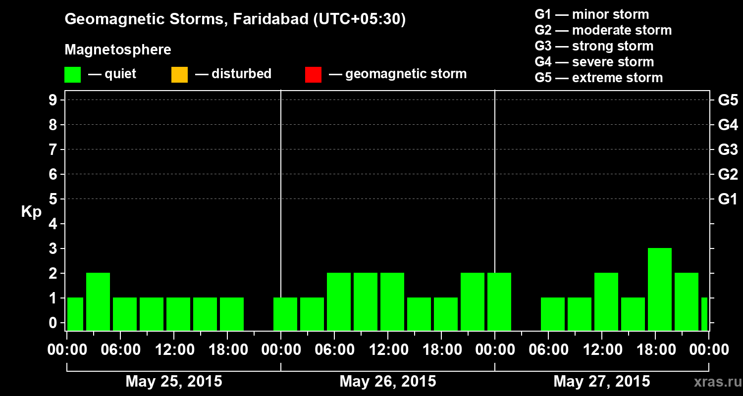 Changes in the geomagnetic index Kp from May 25 to 27, 2015 for mid latitudes