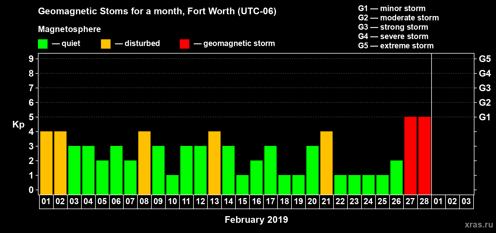 Geomagnetic storms in Fort Worth in February 2019
