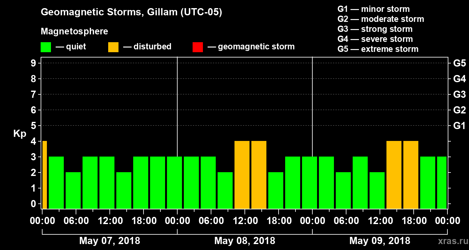 Changes in the geomagnetic index Kp from May 7 to 9, 2018 for mid latitudes