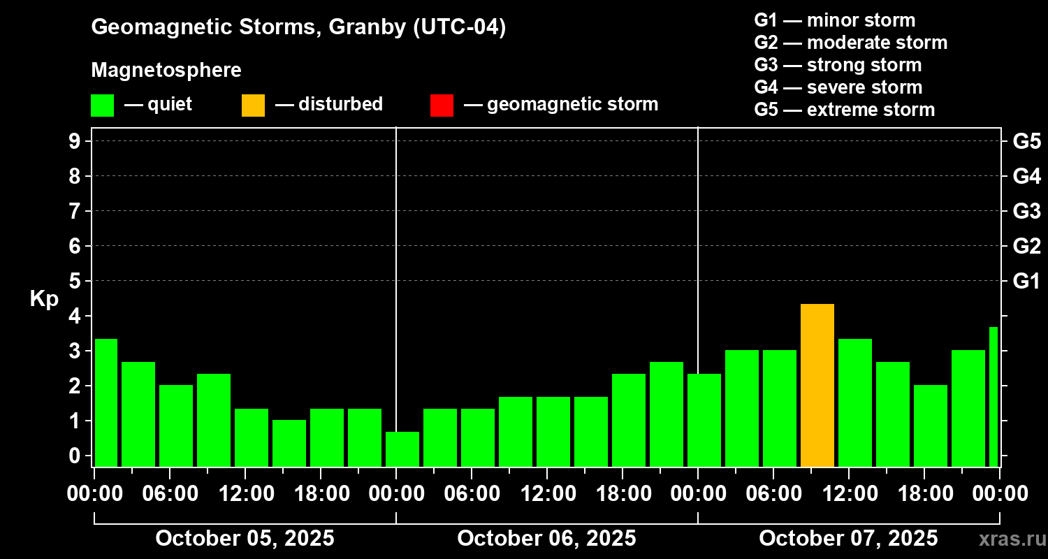 Changes in the geomagnetic index Kp from October 5 to 7, 2025 for mid latitudes