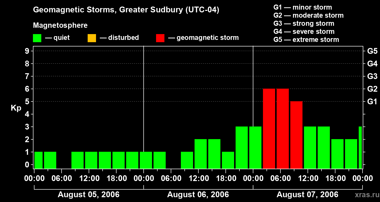 Geomagnetic storms in Greater Sudbury on Aug 07, 2006