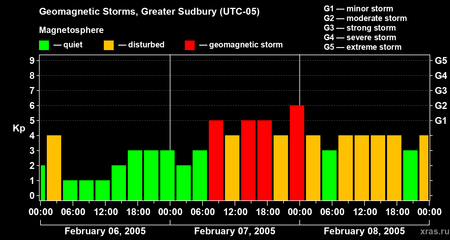 Geomagnetic storms in Greater Sudbury on Feb 08, 2005