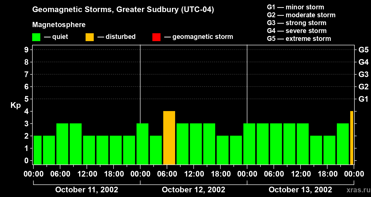 Geomagnetic storms in Greater Sudbury on Oct 13, 2002