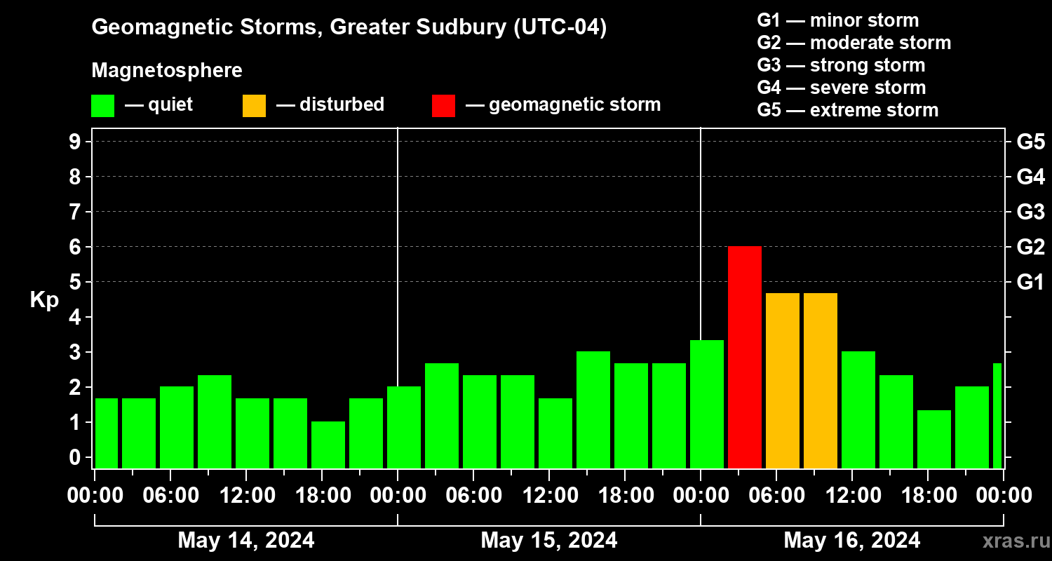 Geomagnetic storms in Greater Sudbury on May 16, 2024