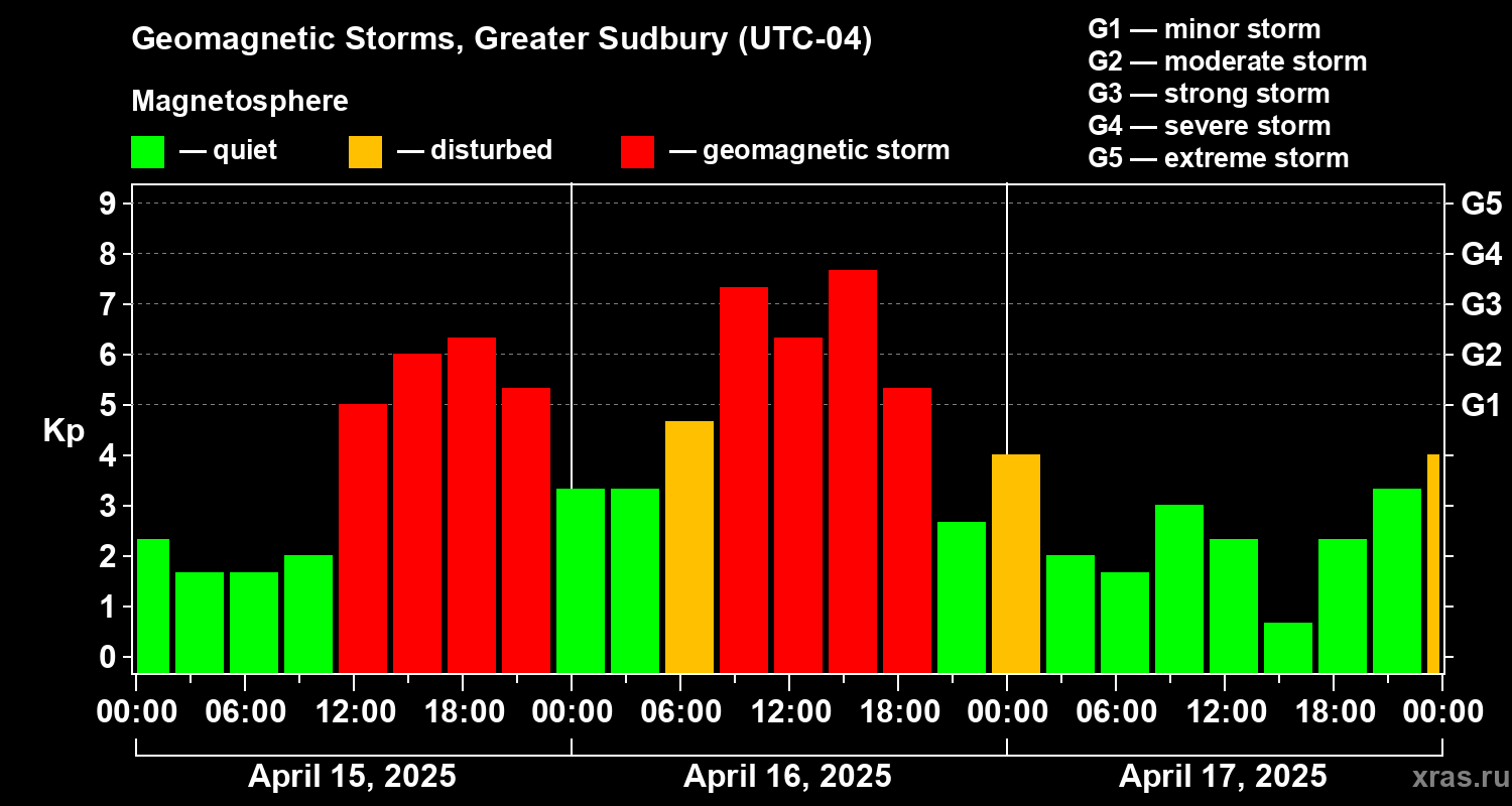 Geomagnetic storms in Greater Sudbury in April 2025