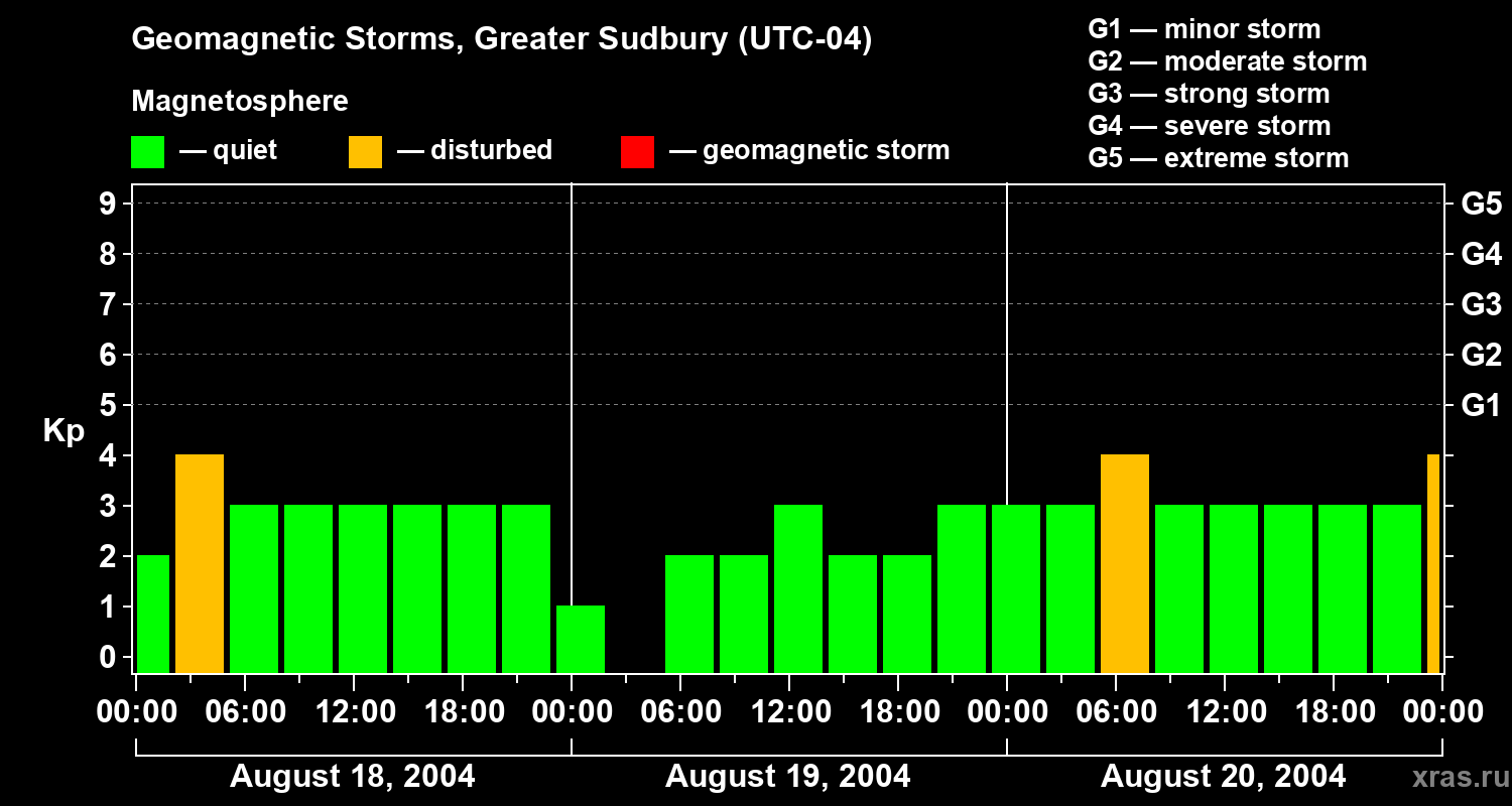 Geomagnetic storms in Greater Sudbury on Aug 20, 2004