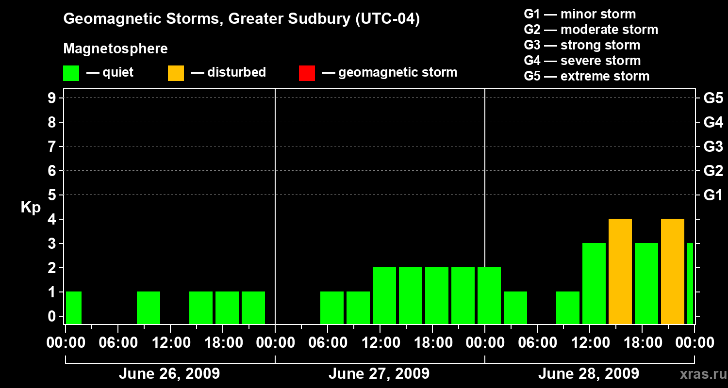 Geomagnetic storms in Greater Sudbury on Jun 28, 2009