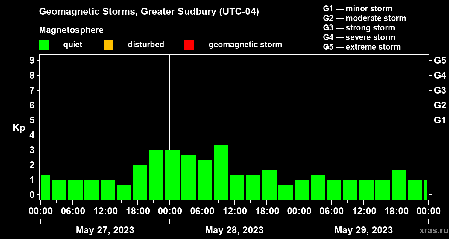 Geomagnetic storms in Greater Sudbury on May 29, 2023
