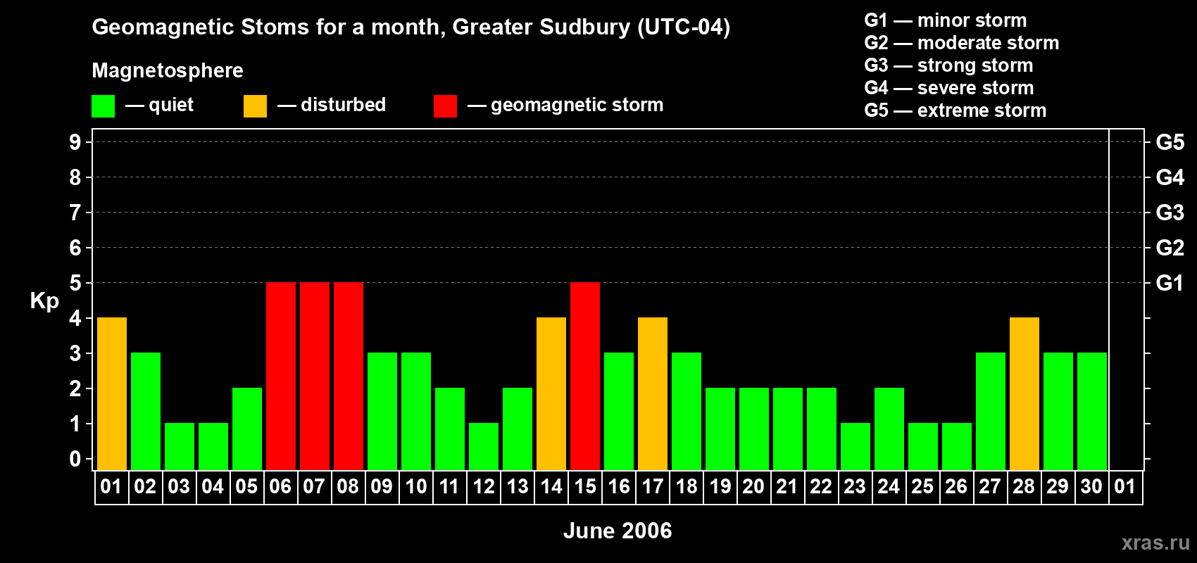 Geomagnetic storms in Greater Sudbury on Jun 30, 2006