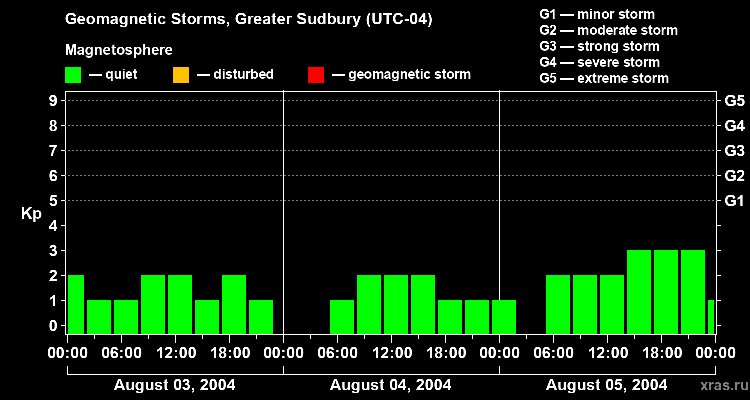 Geomagnetic storms in Greater Sudbury on Aug 05, 2004