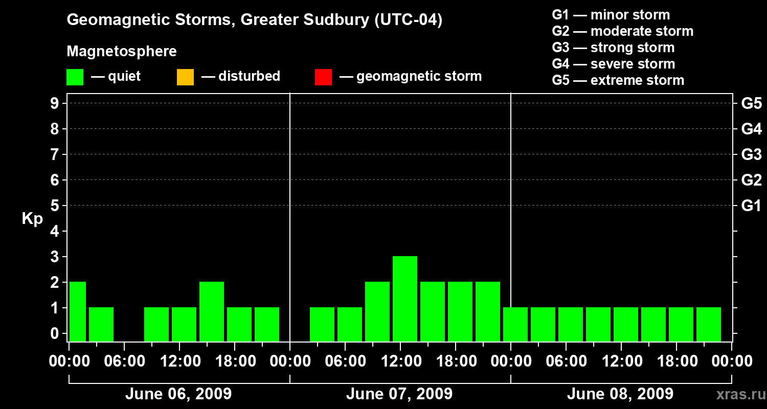 Geomagnetic storms in Greater Sudbury on Jun 08, 2009