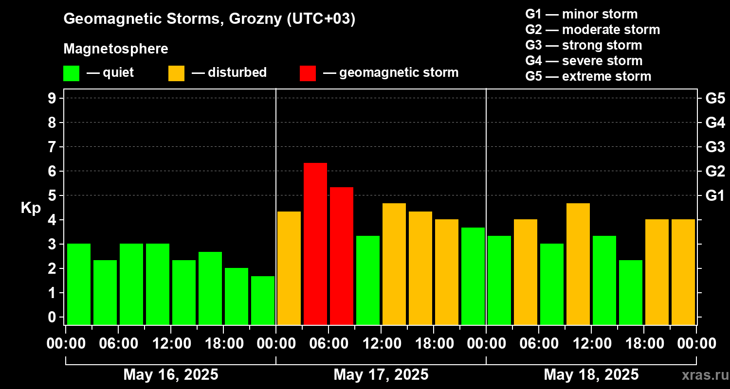 Changes in the geomagnetic index Kp from May 16 to 18, 2025 for mid latitudes
