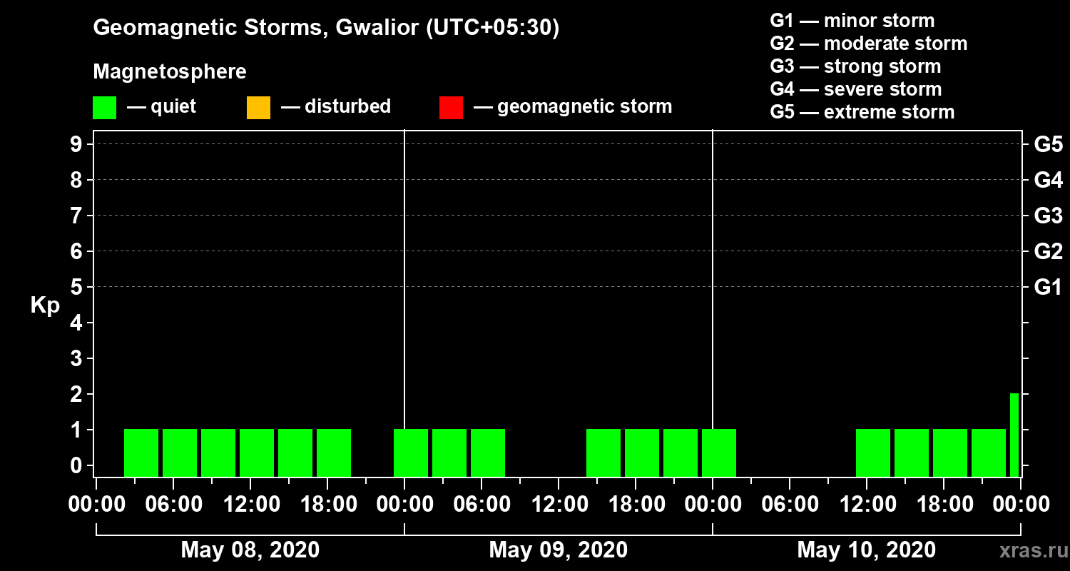 Changes in the geomagnetic index Kp from May 8 to 10, 2020 for mid latitudes
