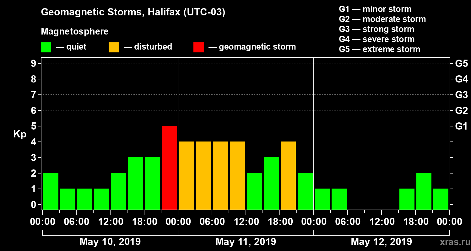 Changes in the geomagnetic index Kp from May 10 to 12, 2019 for mid latitudes