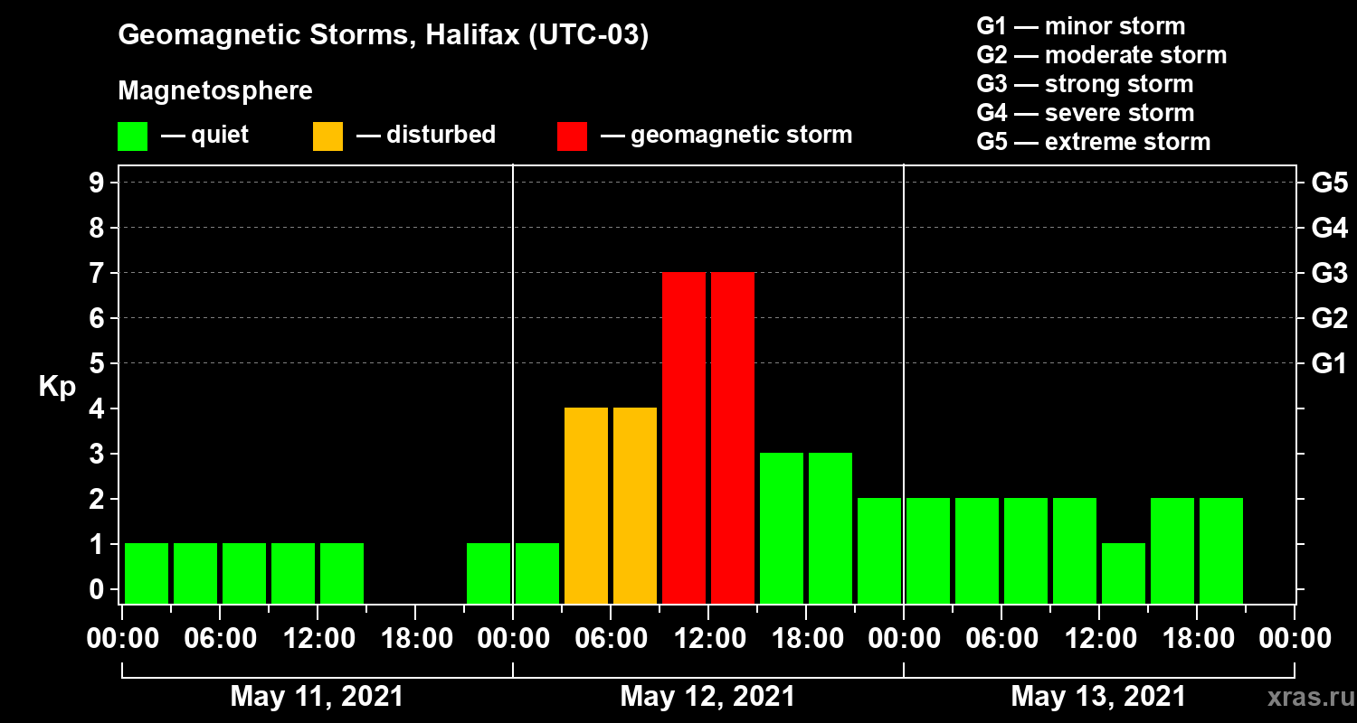 Changes in the geomagnetic index Kp from May 11 to 13, 2021 for mid latitudes