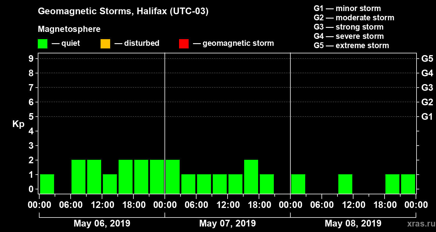 Changes in the geomagnetic index Kp from May 6 to 8, 2019 for mid latitudes