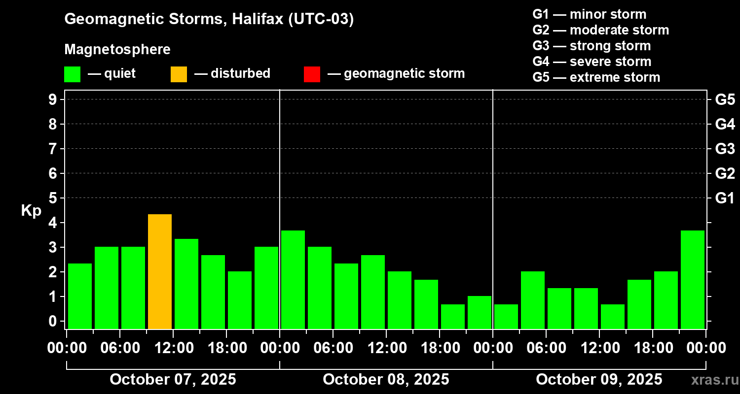 Geomagnetic storms in Halifax on Oct 09, 2025