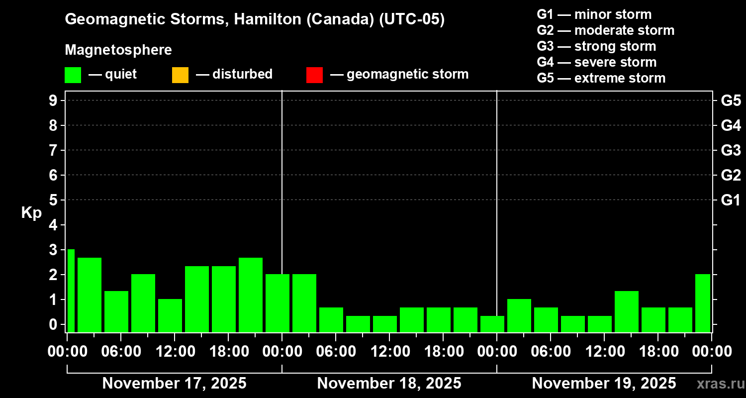 Geomagnetic storms in Hamilton (Canada) — Nov 19, 2025