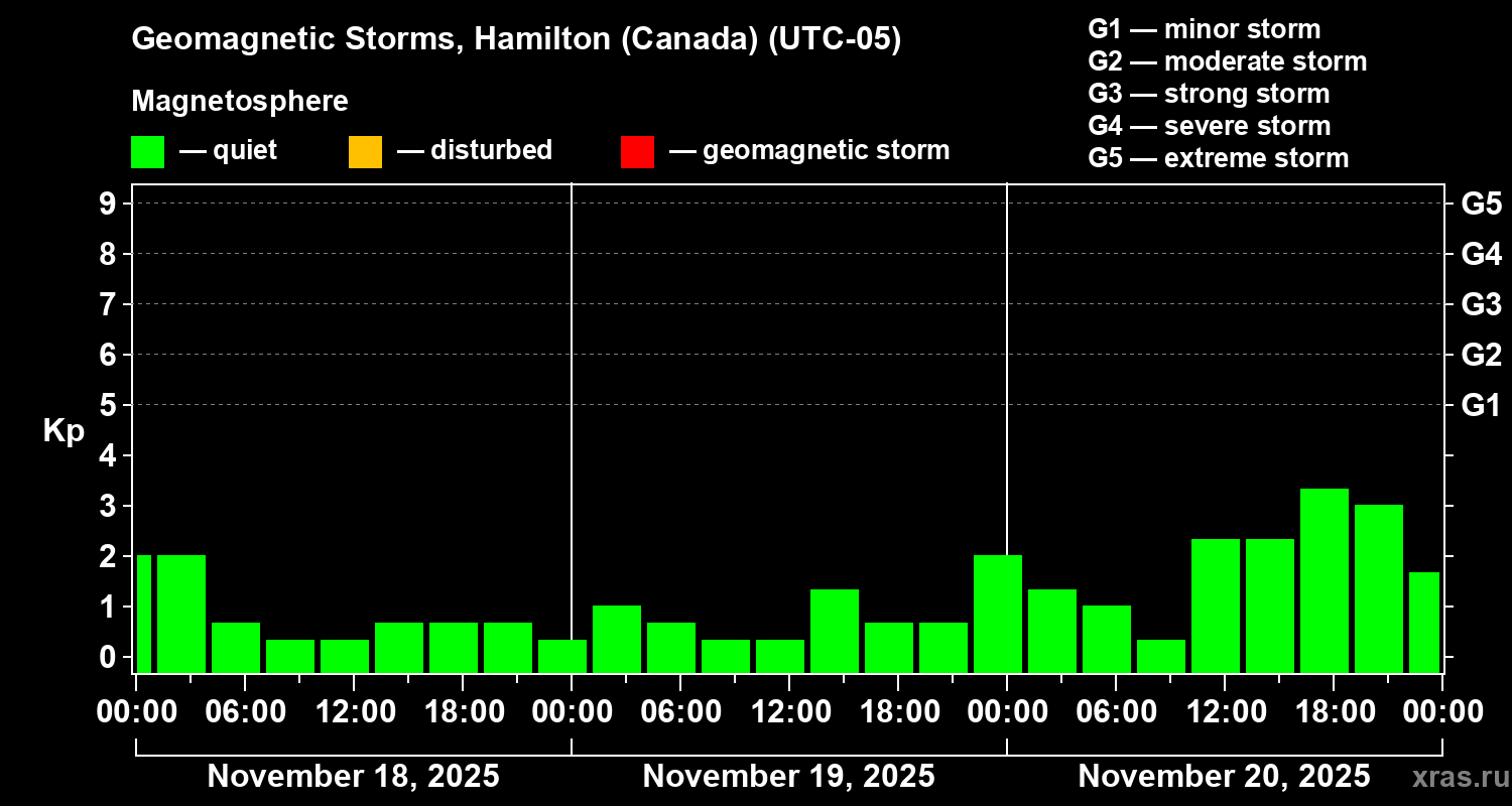 Geomagnetic storms in Hamilton (Canada) — Nov 20, 2025