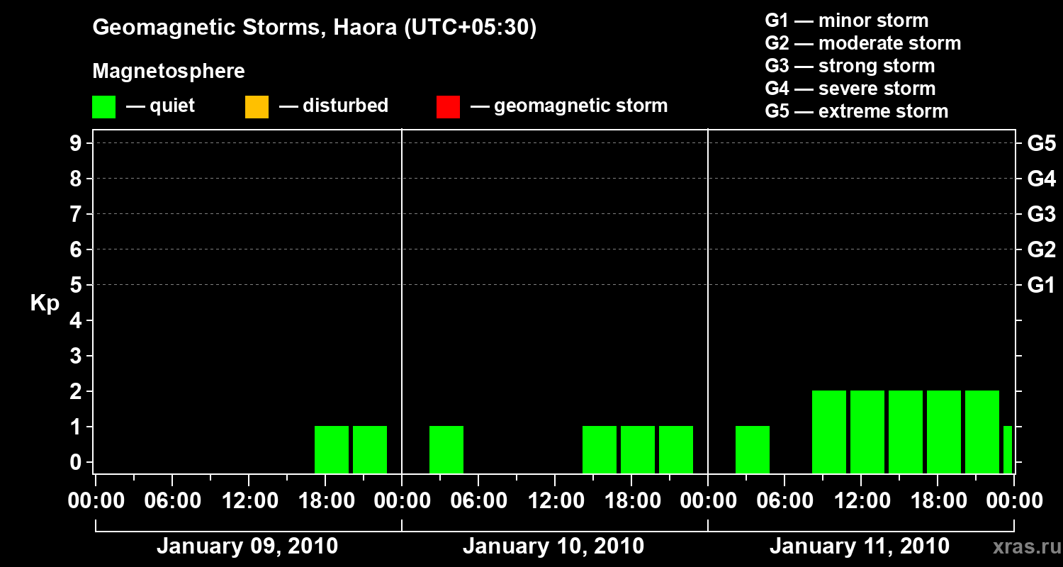 Changes in the geomagnetic index Kp from January 9 to 11, 2010 for mid latitudes