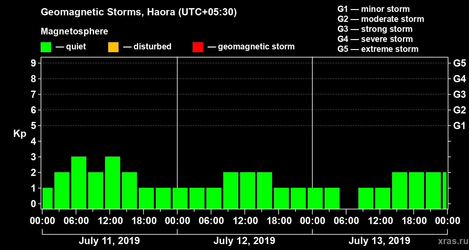 Changes in the geomagnetic index Kp from July 11 to 13, 2019 for mid latitudes
