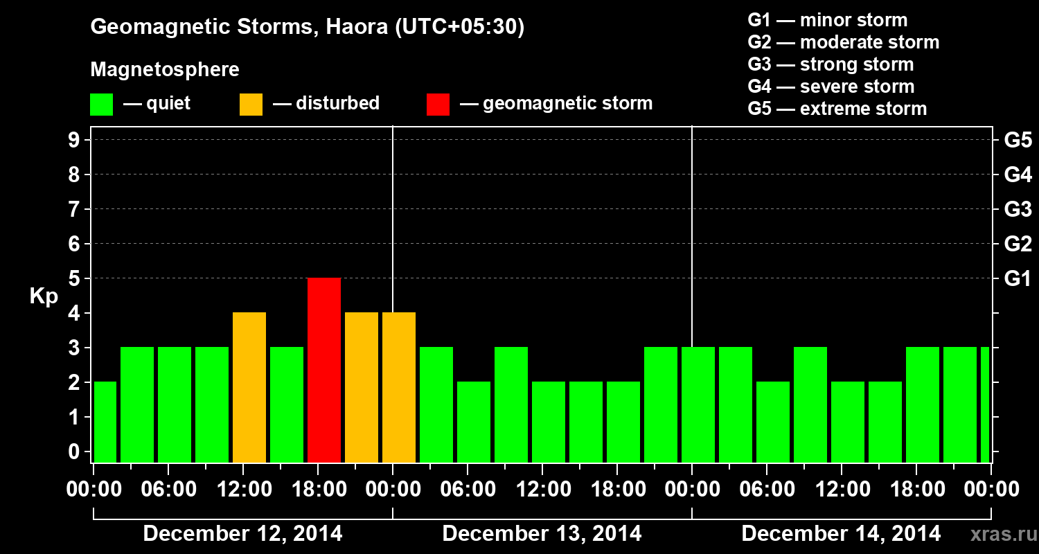 Changes in the geomagnetic index Kp from December 12 to 14, 2014 for mid latitudes