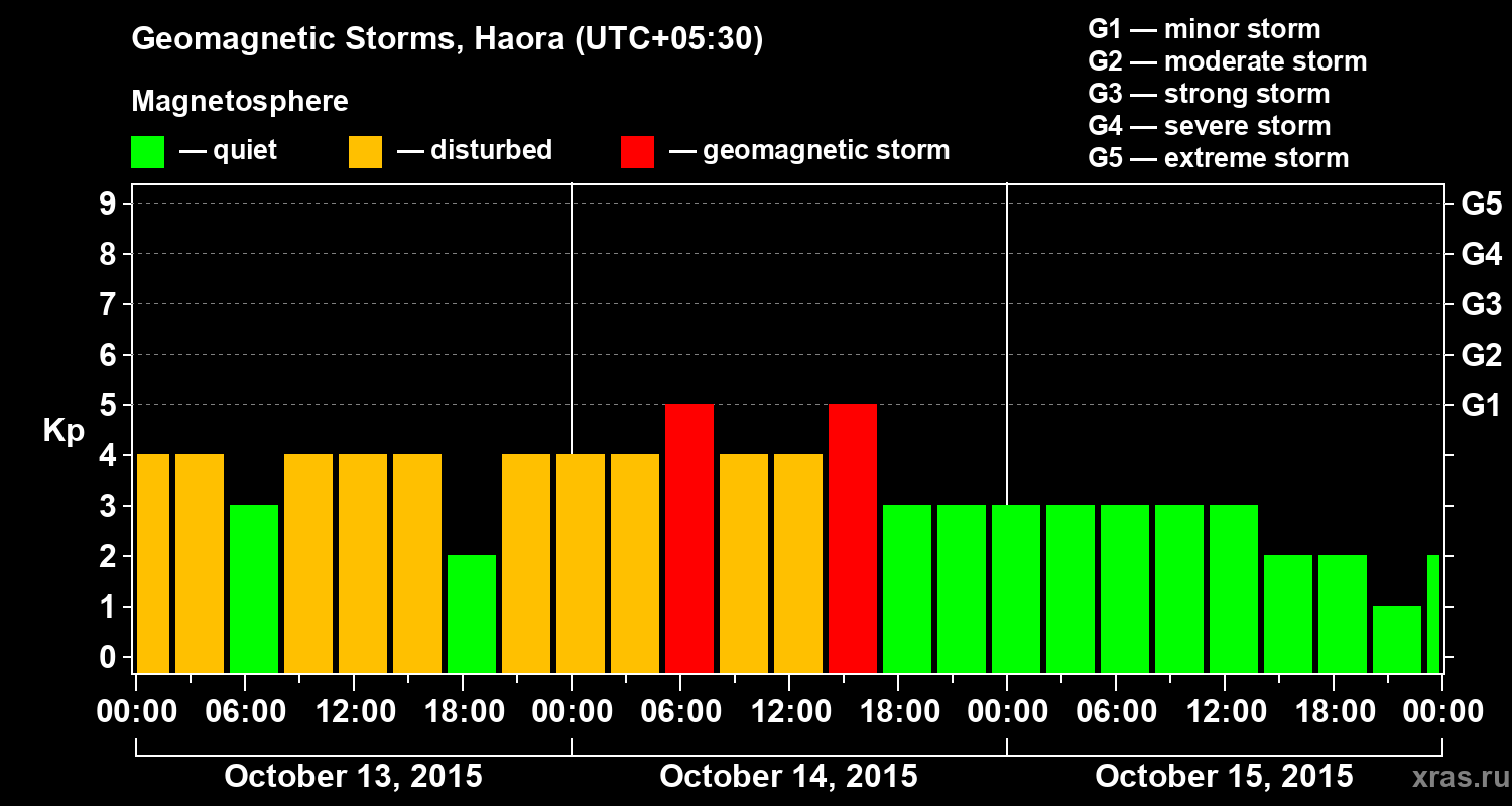 Changes in the geomagnetic index Kp from October 13 to 15, 2015 for mid latitudes