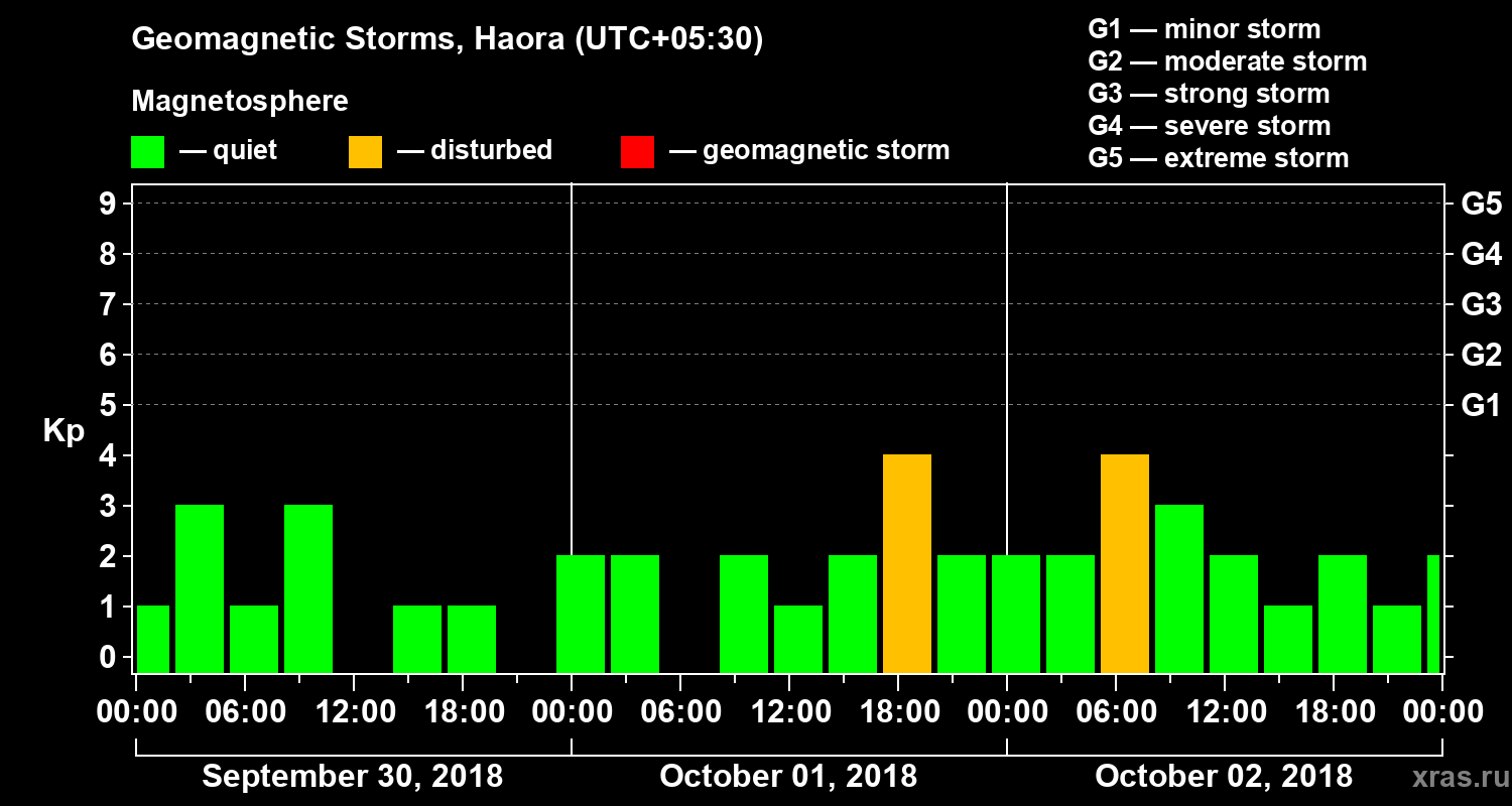 Changes in the geomagnetic index Kp from September 30 to October 2, 2018 for mid latitudes