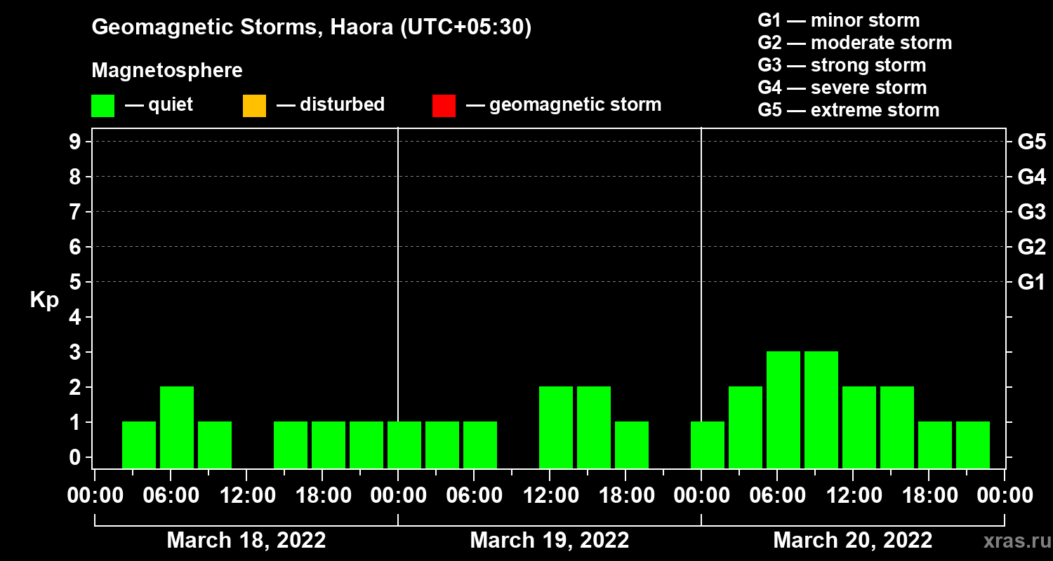 Changes in the geomagnetic index Kp from March 18 to 20, 2022 for mid latitudes