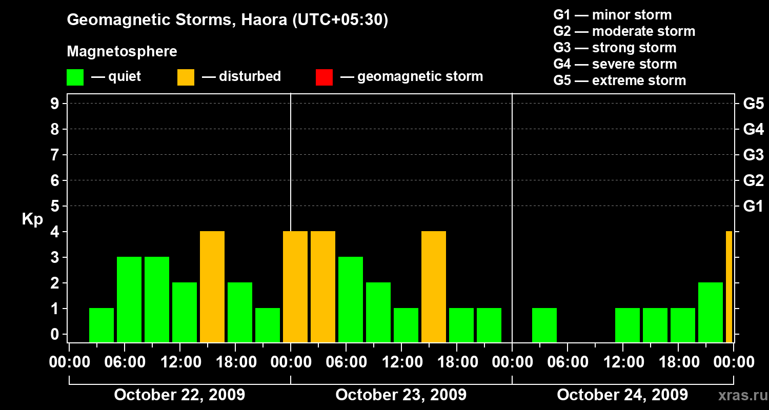 Changes in the geomagnetic index Kp from October 22 to 24, 2009 for mid latitudes