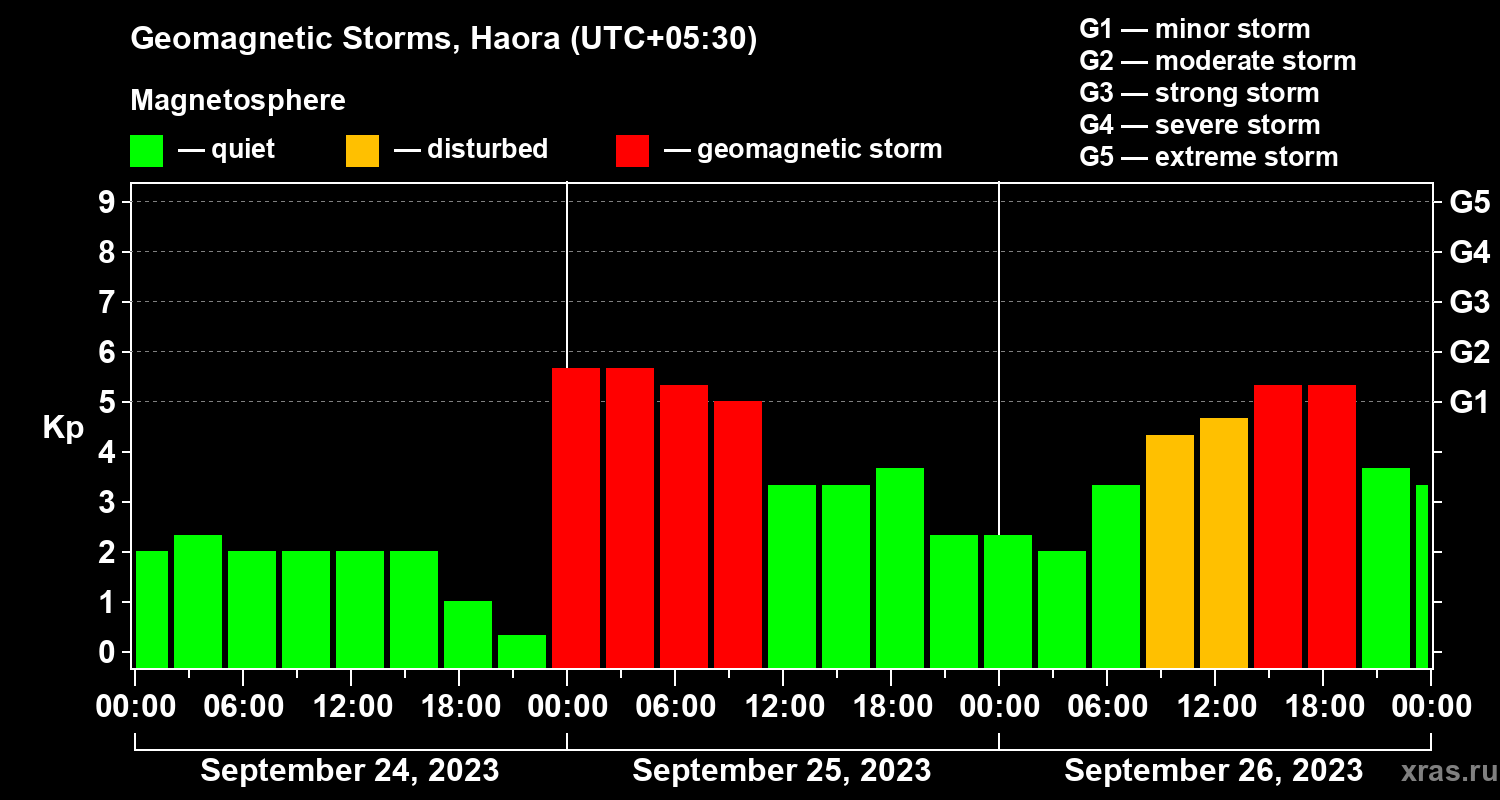 Changes in the geomagnetic index Kp from September 24 to 26, 2023 for mid latitudes