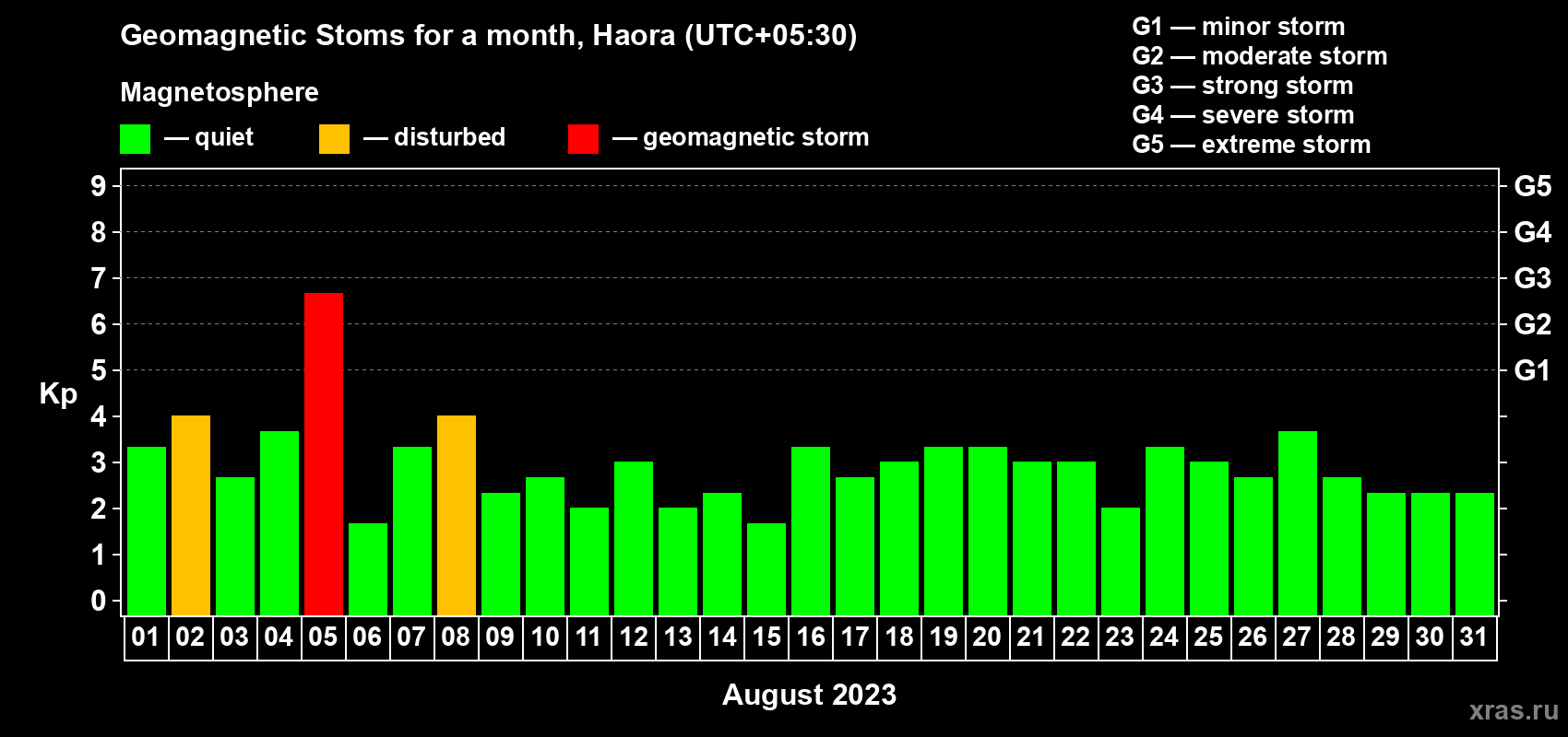 Geomagnetic storms in Haora in August 2023