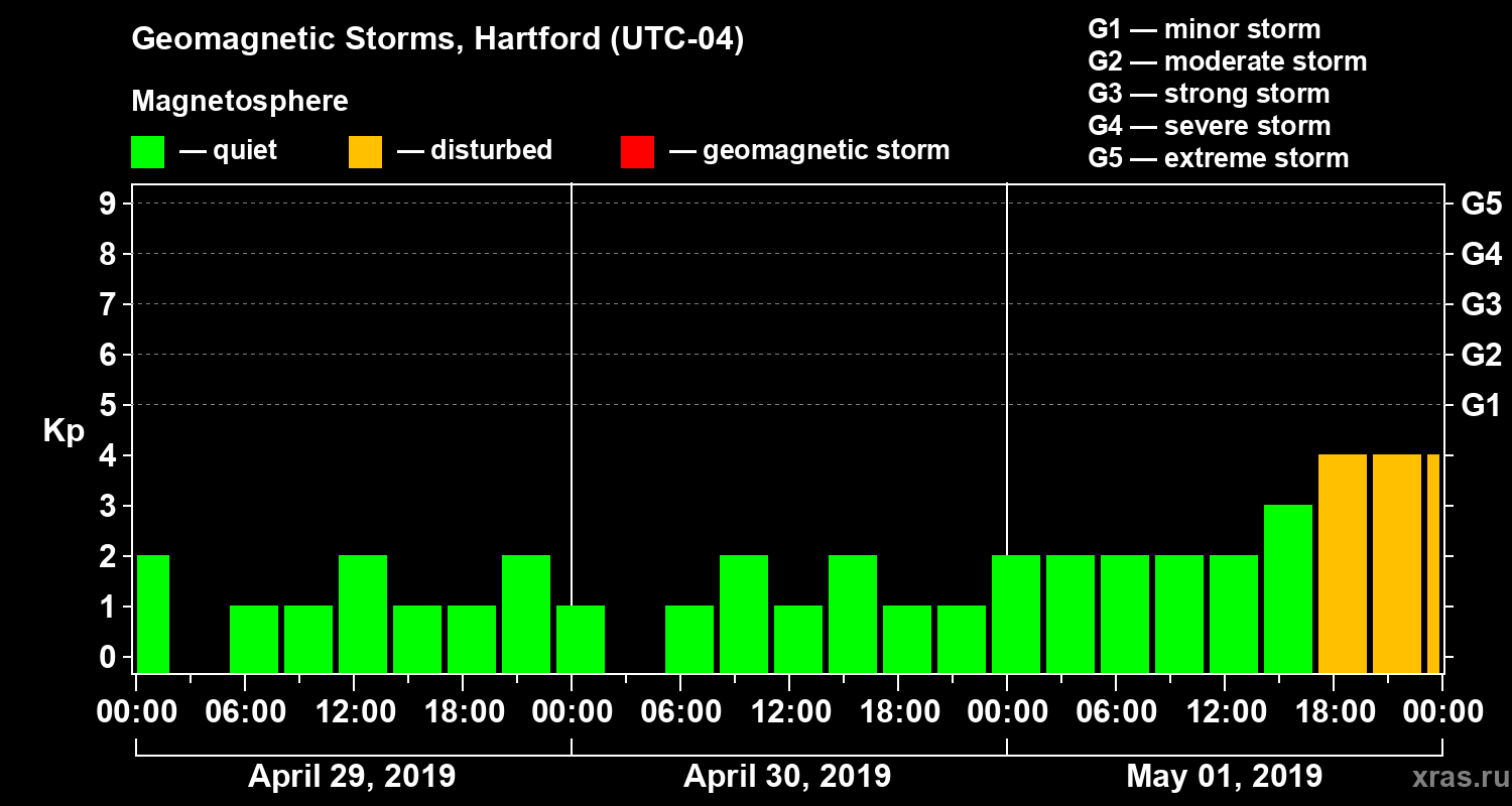 Changes in the geomagnetic index Kp from April 29 to May 1, 2019 for mid latitudes