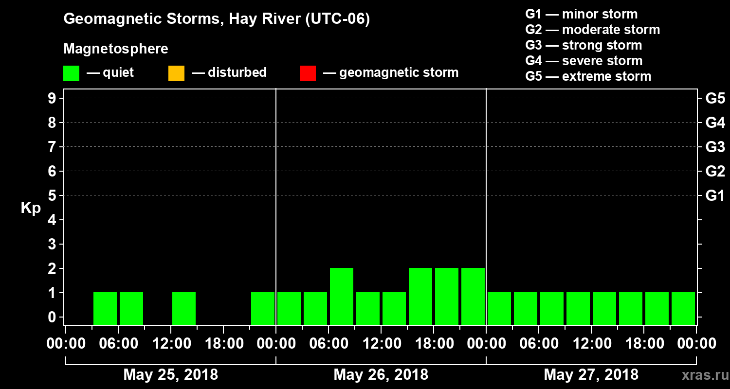 Changes in the geomagnetic index Kp from May 25 to 27, 2018 for mid latitudes