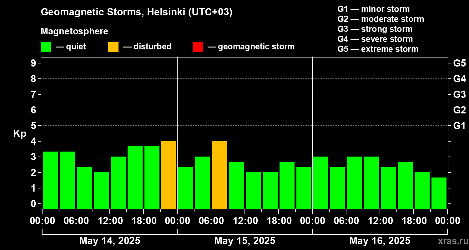 Changes in the geomagnetic index Kp from May 14 to 16, 2025 for mid latitudes