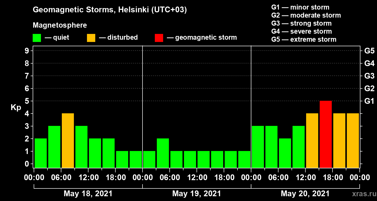 Changes in the geomagnetic index Kp from May 18 to 20, 2021 for mid latitudes