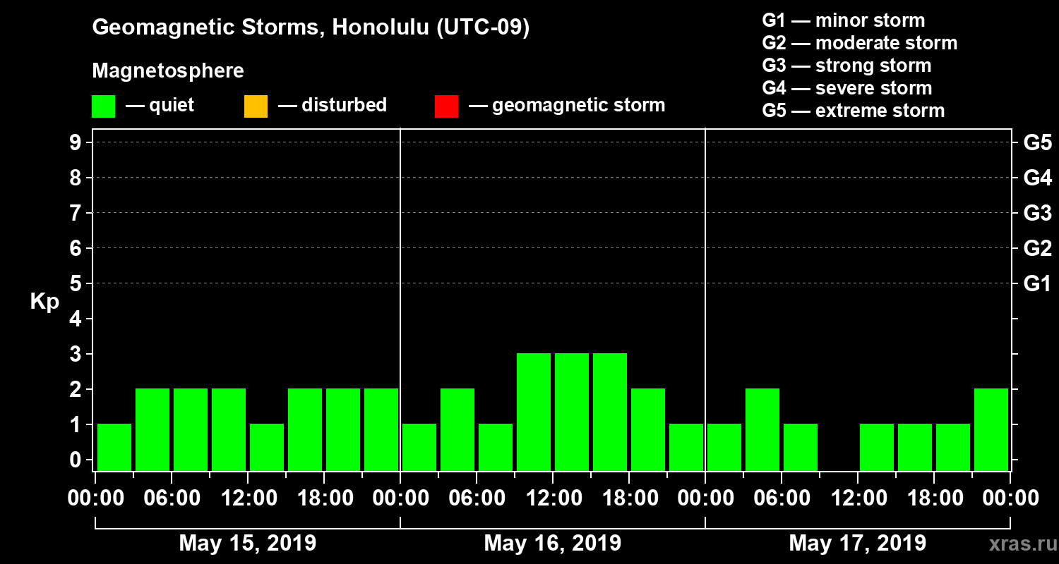 Changes in the geomagnetic index Kp from May 15 to 17, 2019 for mid latitudes