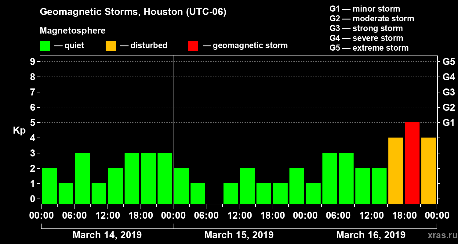 Changes in the geomagnetic index Kp from March 14 to 16, 2019 for mid latitudes