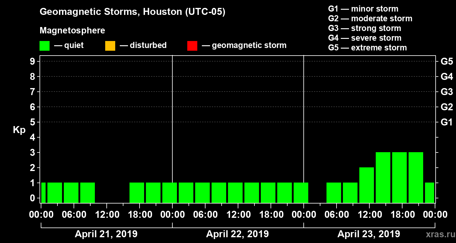Changes in the geomagnetic index Kp from April 21 to 23, 2019 for mid latitudes