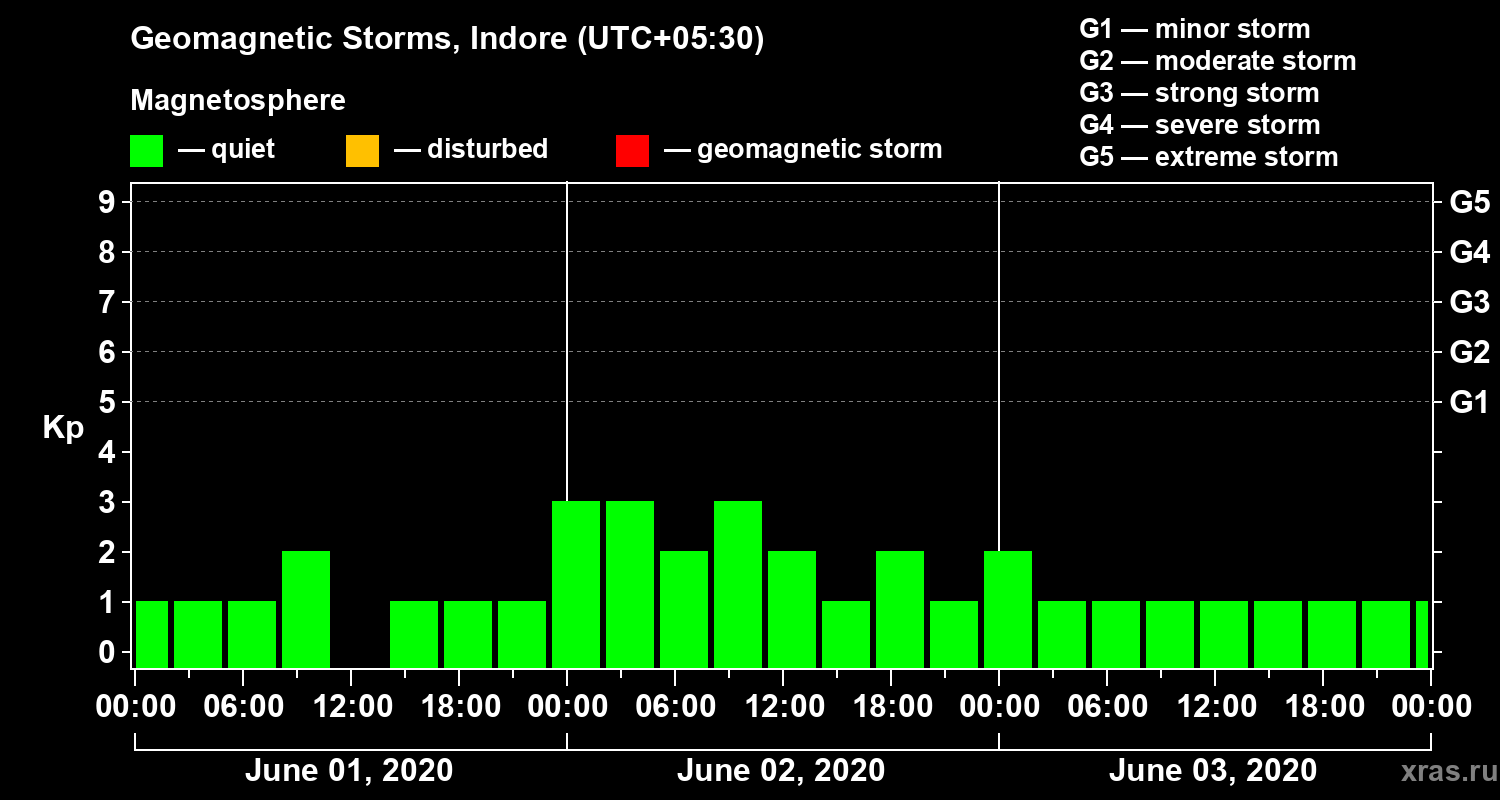 Changes in the geomagnetic index Kp from June 1 to 3, 2020 for mid latitudes