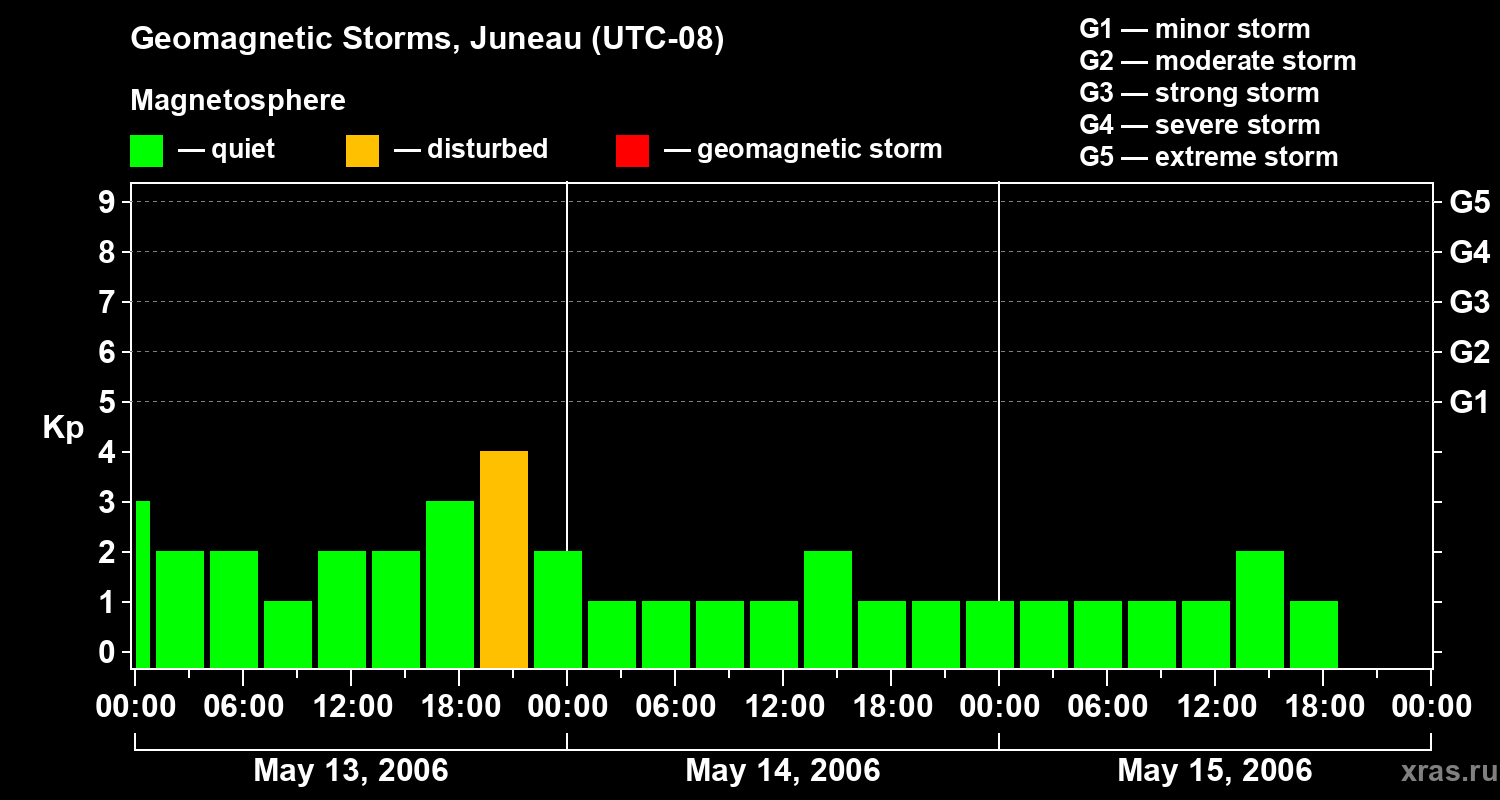 Changes in the geomagnetic index Kp from May 13 to 15, 2006 for mid latitudes
