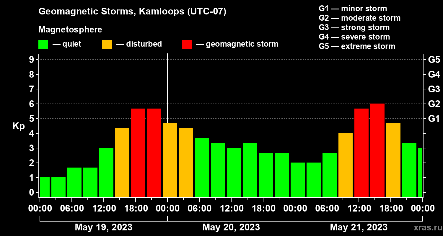 Changes in the geomagnetic index Kp from May 19 to 21, 2023 for mid latitudes