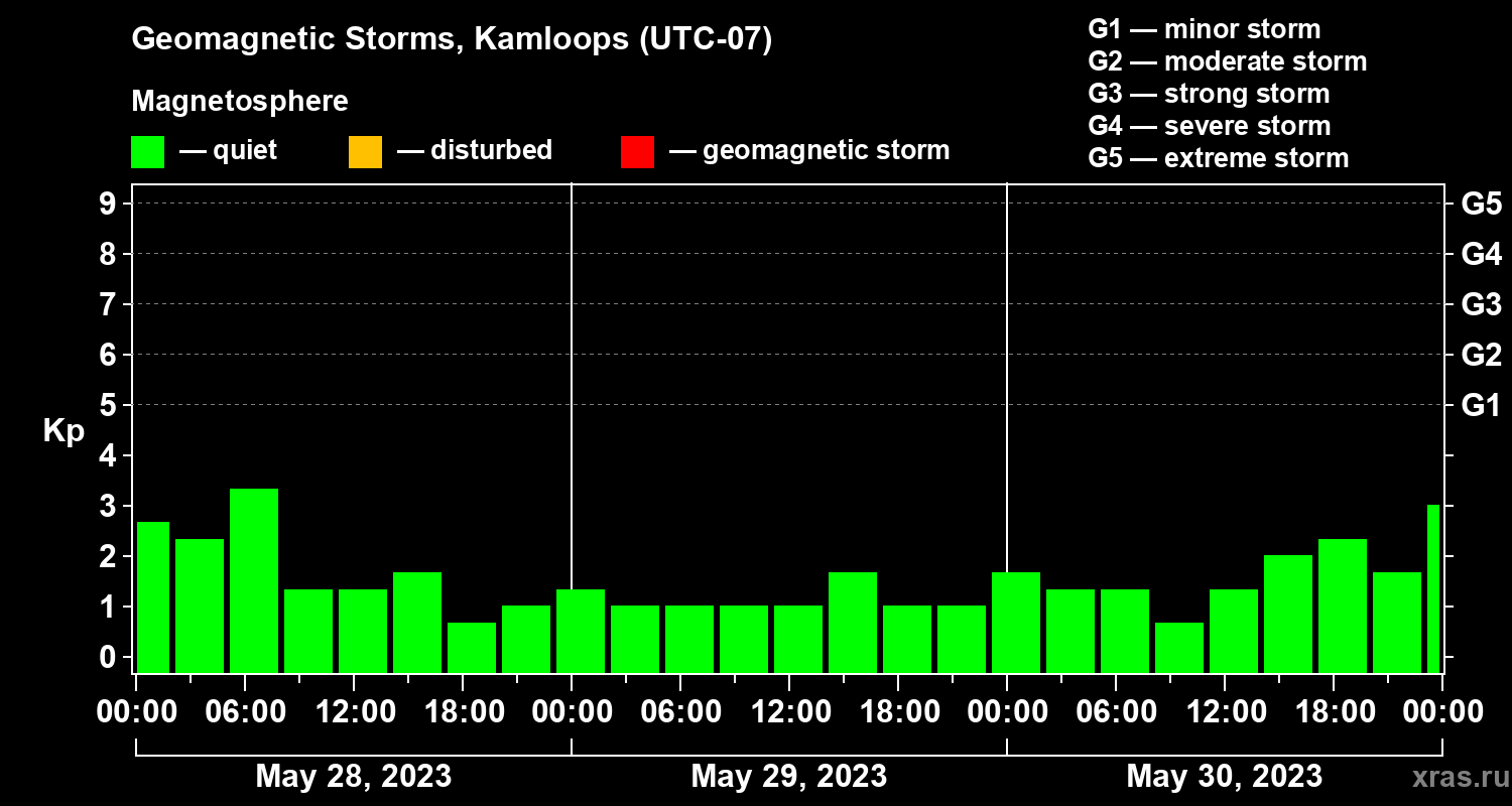 Changes in the geomagnetic index Kp from May 28 to 30, 2023 for mid latitudes