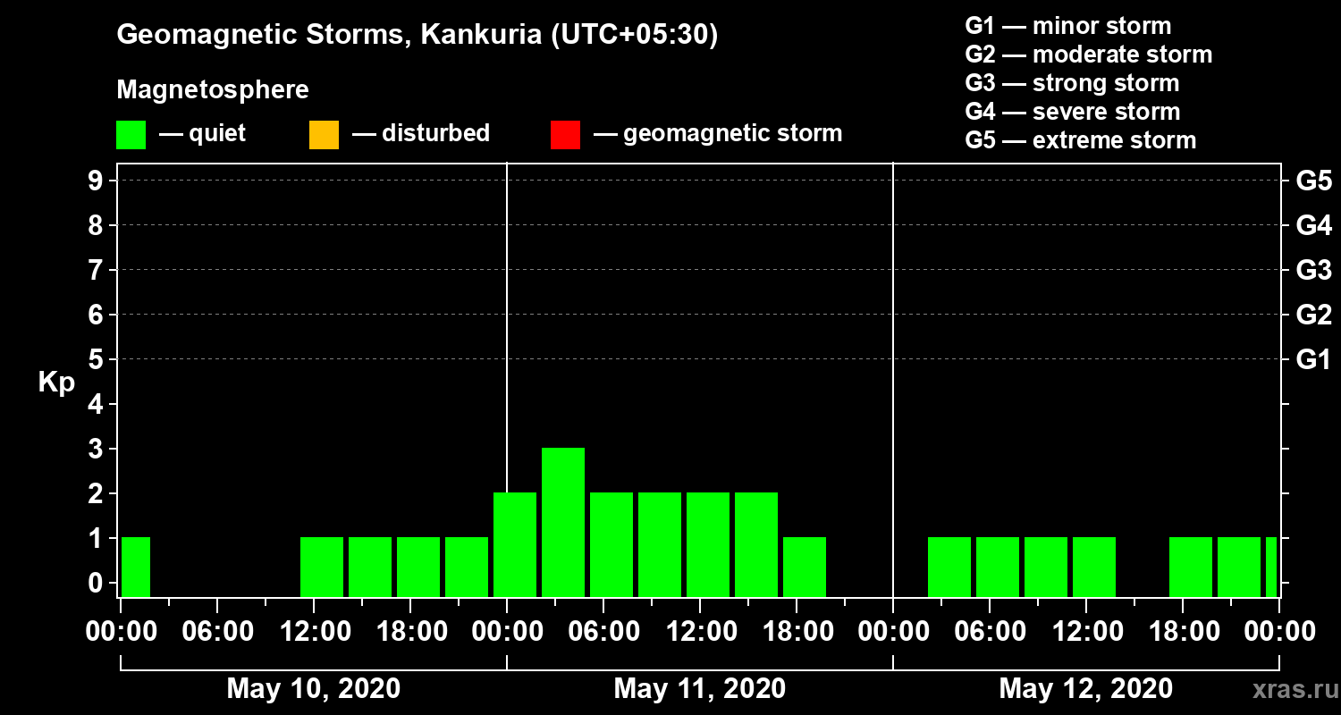 Changes in the geomagnetic index Kp from May 10 to 12, 2020 for mid latitudes