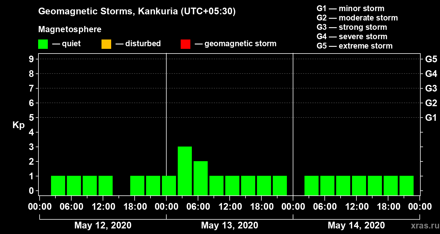 Changes in the geomagnetic index Kp from May 12 to 14, 2020 for mid latitudes