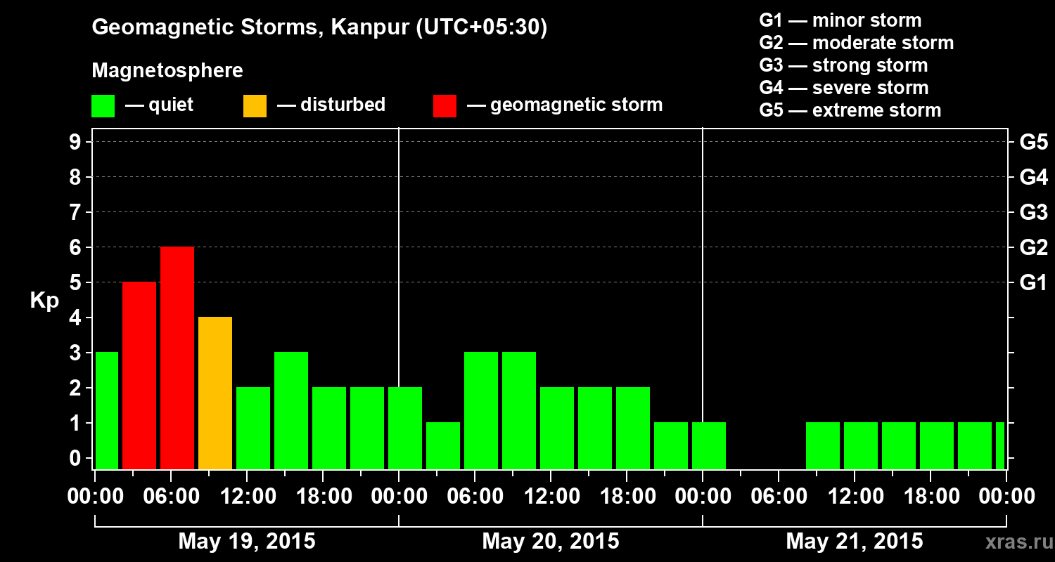 Changes in the geomagnetic index Kp from May 19 to 21, 2015 for mid latitudes