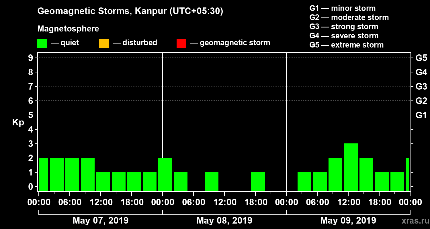 Changes in the geomagnetic index Kp from May 7 to 9, 2019 for mid latitudes