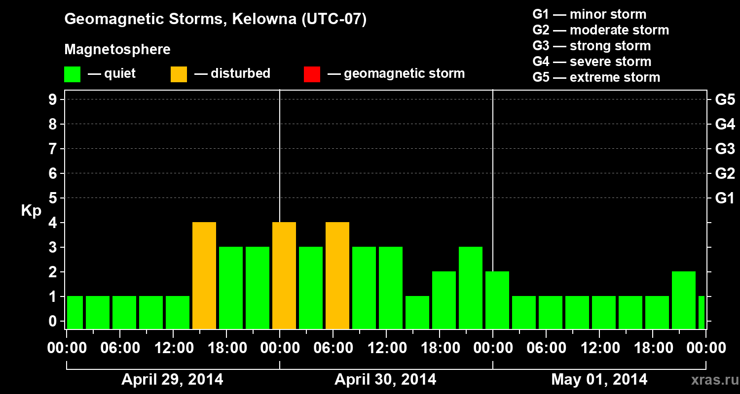 Changes in the geomagnetic index Kp from April 29 to May 1, 2014 for mid latitudes