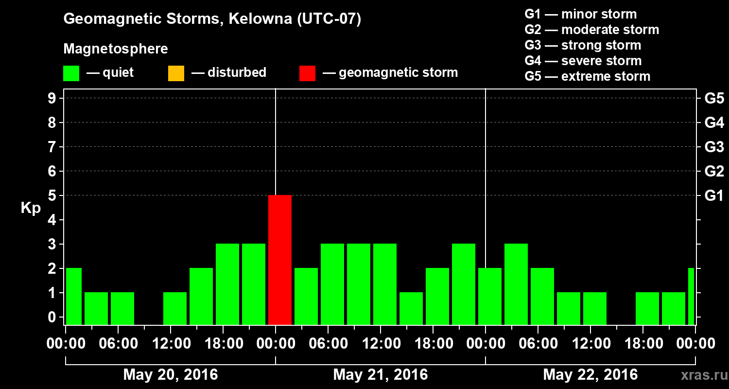 Changes in the geomagnetic index Kp from May 20 to 22, 2016 for mid latitudes